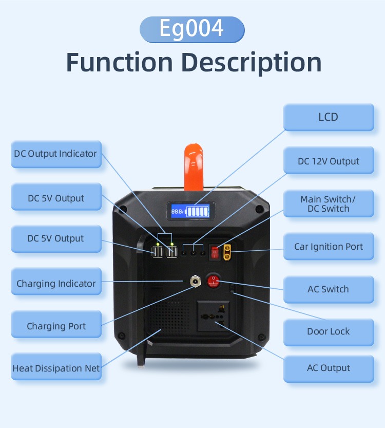 The EG004PB is a remarkable power solution, offering an impressive output of 500 watts and a robust 12V 50Ah capacity. This combination makes it an ideal choice for a wide array of applications, ranging from outdoor adventures to providing energy for essential household appliances. The versatility of the EG004PB enables users to power devices such as lighting systems, photography equipment, and even small electronics, ensuring that your power needs are met in various situations.