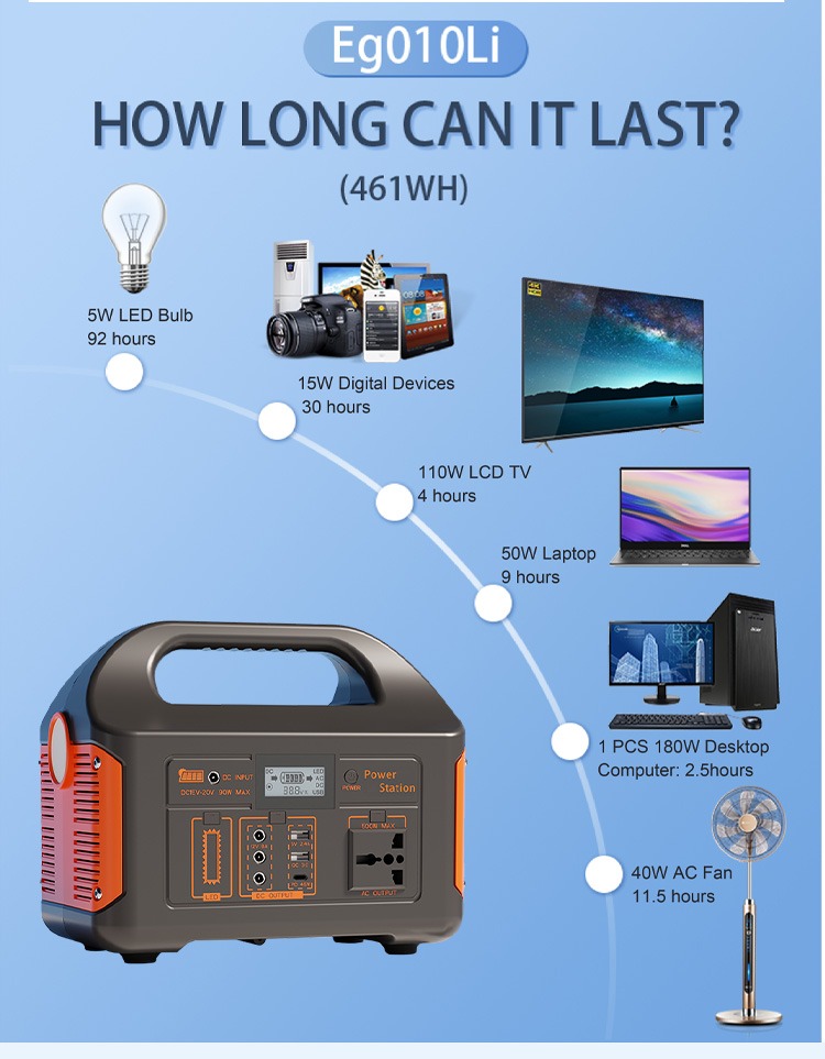 The Eg010Li delivers 500W of stable output, capable of powering various devices such as laptops, drones, mini-fridges, projectors, and lighting equipment. It comes with three capacity options (308WH / 384WH / 460.8WH) to suit different power demands, ensuring your devices stay powered whether on a short trip or an extended outdoor adventure.
